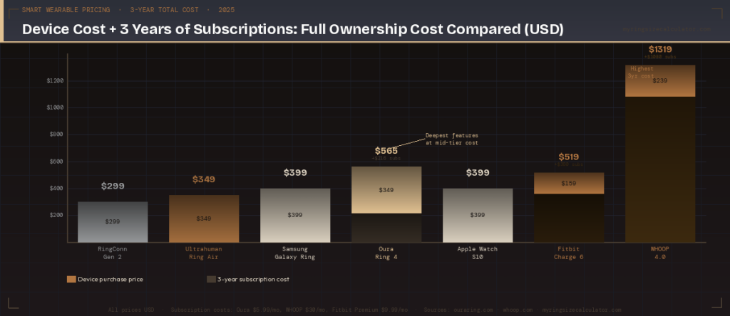 Critical insight: Oura’s $5.99/month subscription is the second cheapest of any subscription-required wearable — cheaper than Fitbit Premium ($9.99) and vastly cheaper than WHOOP ($30). Yet Oura delivers a significantly more advanced health platform than either. For users who engage seriously with Oura’s features, the subscription represents strong value. The real competition for Oura on cost is the subscription-free rings — where the $210–216 three-year subscription cost is the entire differentiator.