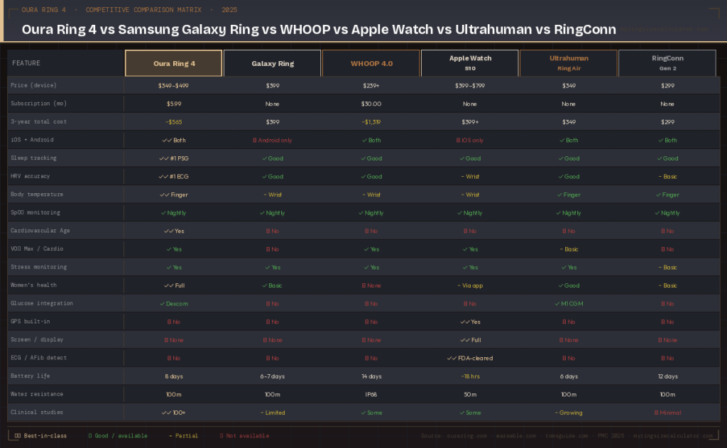 📷  cmp_img1_matrix.png Caption: Oura Ring 4 vs Samsung Galaxy Ring vs WHOOP 4.0 vs Apple Watch Series 10 vs Ultrahuman Ring Air vs RingConn Gen 2 — 19-feature competitive comparison matrix, 2025.Alt: “Oura Ring 4 vs Samsung Galaxy Ring vs WHOOP vs Apple Watch vs Ultrahuman Ring Air vs RingConn Gen 2 comparison matrix showing 19 features including sleep accuracy, HRV, price, subscription, battery life, and more”